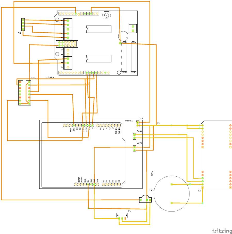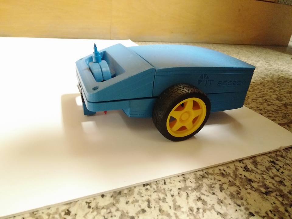 After obtaining the new Arduino board for the team, project development has been continued. To work around the cable connectivity problems, the extension pins have been soldered on to the Motor Shield, as well as to the IR sensor. To connect the IR to the robot, the team have used female - female connectors that are attached to the cables. The next step was soldering the Switch ON - OFF, between the battery and Arduino, to be able to turn the device on and off. Further phase in the development was soldering cables to the DC motors and preparing the pins for proper Arduino connection. After assembling all the part together, and updating the code, the Graphbot has started to work properly. Properly working means that after turning on the Graphbot and system initialization, the user can hear “beep” sound, meaning shield is waiting for voice command. Time limit for voice recognition is set down to 5 seconds. After that the user can hear another ‘’beep’’, meaning that the Robot waits for further commands. While waiting for a voice command, simultaneously the IR sensor receives the value of reflected light from the surface. If this value exceeds 900, it means that the robot entered black surface and DC motors stop functioning. When the Robot hears a command to go forward, first the IR value is checked. If it is less than 900, meaning it remains on a white surface, the Robot is allowed to start moving forward. When the robot turns left, the left wheel is turned on to move forward and the right one is turned backwards simultaneously, both only for 0.3 seconds and after that they turn off. It allows to rotate the Robot about 90 degrees. The same applies when turning right but the motion is the opposite. Backward command causes that the Robot first starts to move backward, then IR value is checked. If it remains on the white surface, movement continues. If not, the DC motors are disabled. When user gives a command to change the color, stepper motor receives a signal to perform rotation from its current position to 500 micro steps forward, which gives a 90-degree rotation. This operation is performed in the background, while waiting for voice commands. Stop command immediately disables both DC motors, without any conditions. __ In the testing of the prototype the team had some success. The idea was to test all the designed functionalities and as first were the wheels. There was a small problem with the rubber on the wheels touching the chassis because the connections with the DC motors and wheels are very close to each other. For this reason the robot did not go perfectly straight and the torque was higher. The microphone on the EasyVR proved to be a little weak. It had a hard time hearing the commands at times. All the other commands it understood quite well except with the command ‘’CHANGE’’ was almost impossible. That is when the team decided to change the command to ‘’SPIN’’ and this then worked better and the robot could change color. All the movement worked well and even the infrared sensor that was designed for detecting the paper proved to be working and the robot stops immediately on the edge of the paper.