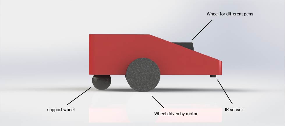 Another form of robotic art which is commonly used in society is the drawing robot which travels on wheels. This consists of a robot with 2 wheels and the pen attached at to the robot so that the device is stable and can travel around the paper freely but has no particular precision when drawing.